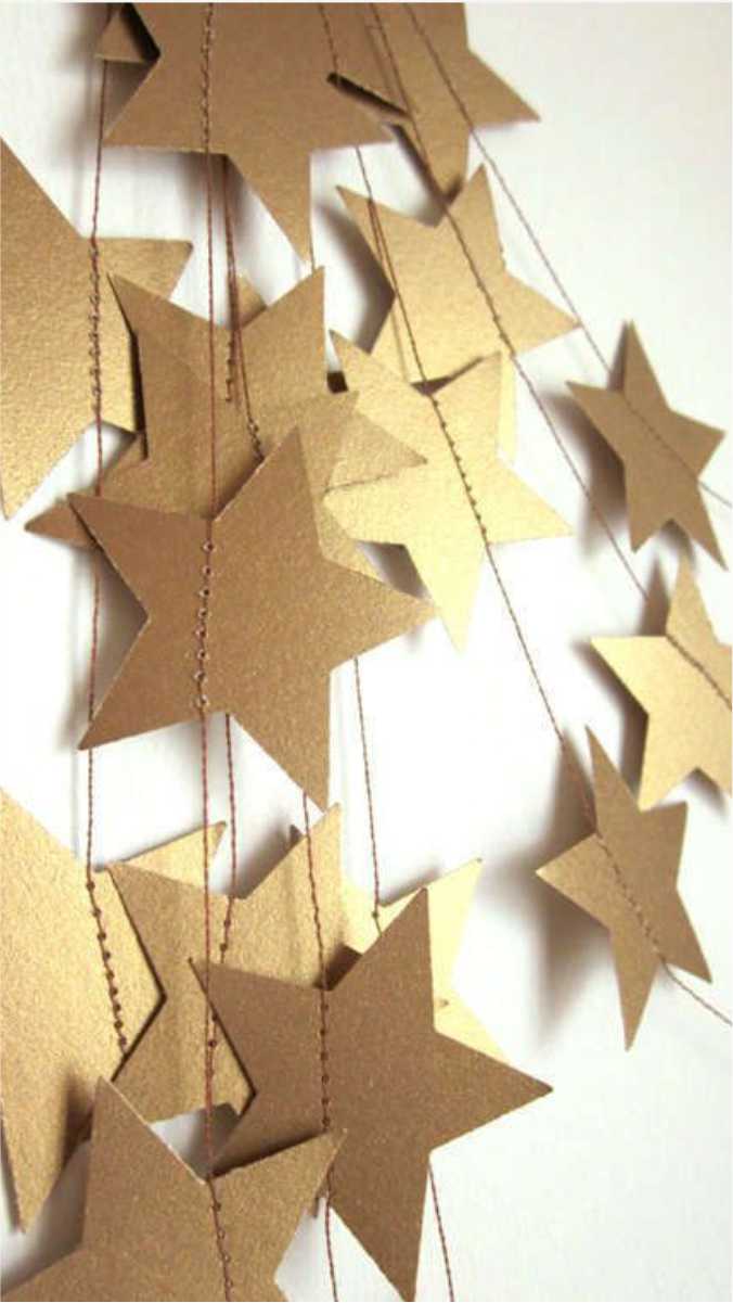 Newyear की पार्टी की सजावट के लिए कार्डबोर्ड पर star ड्रॉ करके उनको कट करे और गोल्डन कलर करके उन stars को धागे मे एक एक करके डाले ऐसे कई सारे बना ले उसको घर की दीवार पर सजावट के लिए लगाए ।