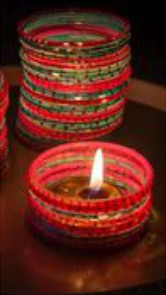 बेकार चूड़ियों से आप कैन्डल स्टैन्ड बना सकते है, इसके लिए कुछ चूड़ियों ले उन सबको एक के ऊपर एक ग्लू की सहायता से छिपा दे उसकी सतह के लिए कोई भी कार्डबोर्ड कट कर चिपका दे अच्छे से सूखा ले और काम मे ले ।